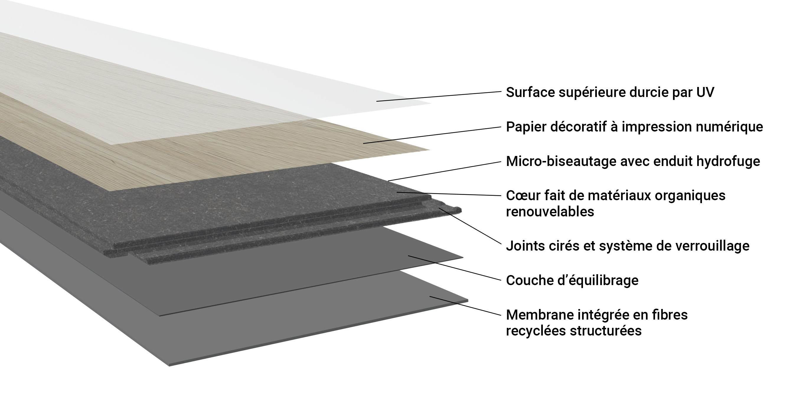 Sans PVC, carbone négatif, composé de fibres de bois renouvelables et de résines d’origine végétale.